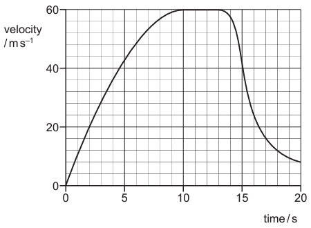 The graph shows the vertical velocity of a parachutist during the first 20 s of her jump.