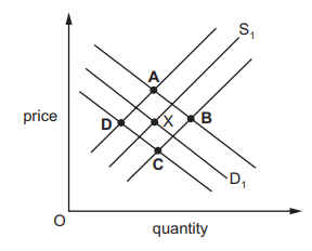 The diagram shows demand and supply for bread made from wheat and X is the original equilibrium point.