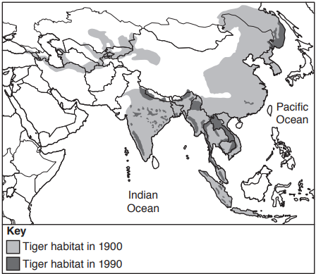 The map shows the world tiger habitat for 1900 and 1990.