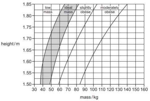 For the data provided about body mass and height, which person would benefit most from the introduction of a calorie-controlled diet and regular exercise?