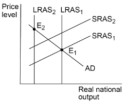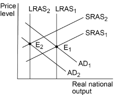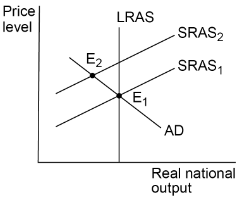 A small island economy suffers extensive damage from a hurricane. The following box diagrams show aggregate demand (AD), short-run aggregate supply (SRAS) and long-run aggregate supply (LRAS) for the economy. Equilibrium before the hurricane is at E$_1$.