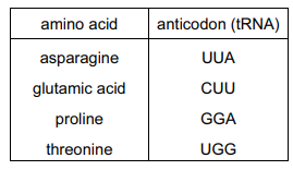 The table gives the tRNA anticodons for four amino acids.