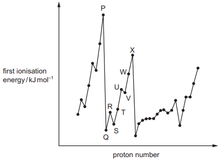 The graph shows the variation of the first ionisation energy with proton number for some elements. The letters used are not the actual symbols for the elements.