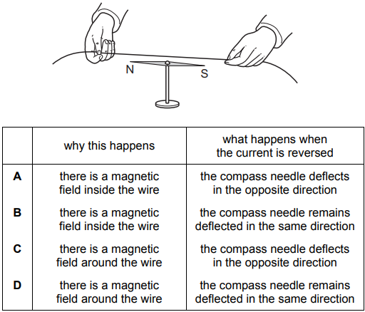 An electric current is switched on in the wire and the compass needle is deflected.
