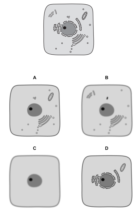 The diagram below is drawn from an electron micrograph of an animal cell.