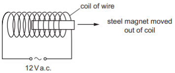 A steel magnet is placed inside a coil of wire. There is a large alternating current in the coil. The magnet is slowly moved out of the coil to position P.