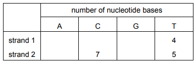 A short piece of DNA, 19 base pairs long, was analysed to find the number of nucleotide bases in each of the polynucleotide strands. Some of the results are shown below.