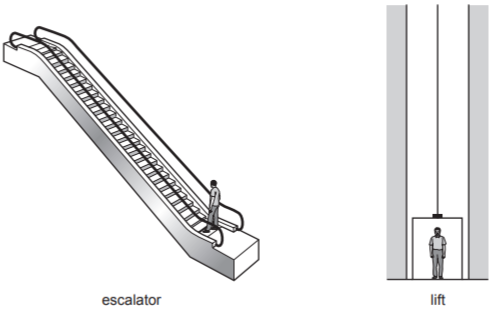 The escalator takes 20 seconds to carry a man to street level. The useful work done is W. The useful power developed is P. The lift takes 30 seconds to carry the same man to street level.