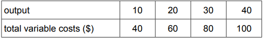 A firm has fixed costs of $20 and the following total variable costs.