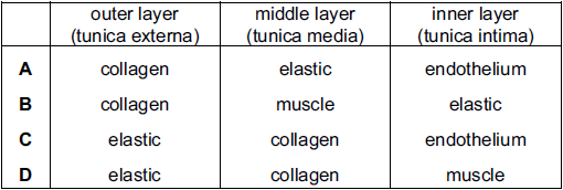 Which row correctly identifies the main tissues found in the three layers of the wall of an artery?