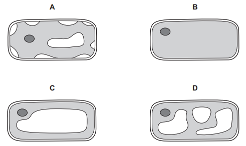Which diagram shows the appearance of a plant cell several minutes after it has been placed in a concentrated solution of sugar?