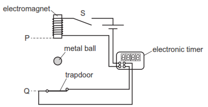 When switch S is opened, the ball is released from an electromagnet and an electronic timer is started. The ball then falls vertically downwards. The timer stops when the ball hits a trapdoor. The student measures the distance PQ between the electromagnet and the trapdoor. This distance and the reading on the timer are then used to calculate the acceleration of free fall.