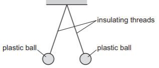 The diagram shows two light plastic balls suspended by insulating threads from a support.