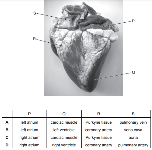 Which row identifies the position of the structures labelled P, Q, R and S?