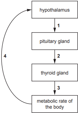 Which numbers on the diagram represent the hormones TSH and thyroxine?