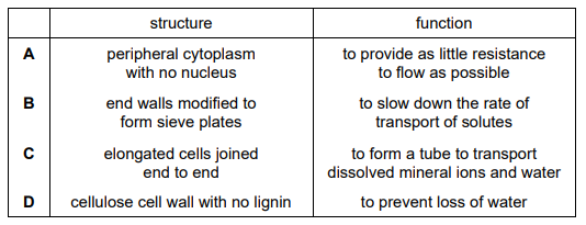 Which row correctly matches the structure and function of phloem sieve tube elements?