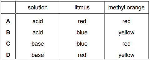 Which row shows the colours of litmus and methyl orange with solutions of acids or bases?