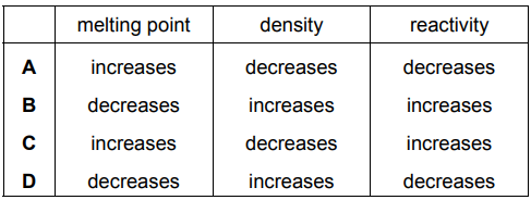 Which row shows the trend in melting point, density and reactivity as Group I is descended?