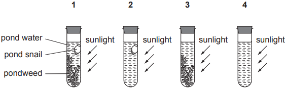 Pond snails and pondweed are living in water in sealed test tubes.