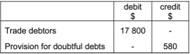 At 30 April 2003 it was decided to write off a bad debt of $800 and to make a provision for doubtful debts of 2 % of trade debtors. During the year an amount of $200 was received from a customer relating to a debt that was written off in the year ended 30 April 2002.