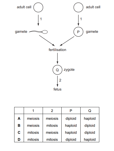 Which row identifies the type of cell division occurring during stages 1 and 2 and the number of chromosomes in cells P and Q?