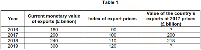 Table 1 shows the index of export prices, the current monetary value of a country’s exports and the calculated value, to the nearest £ billion, of the value of its exports at 2017 prices.