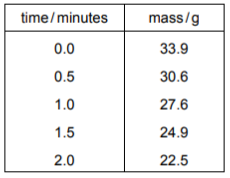 A student measures the mass of warm water in an open container over two minutes. The container is kept at a constant temperature. The results are in the table.