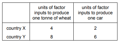 The table indicates the factor inputs required to produce wheat and cars in countries X and Y.