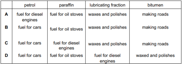 Which row shows the correct uses of the fractions obtained from petroleum?