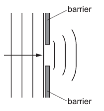 A wave on the surface of water passes through a gap between two barriers and is diffracted, as shown.