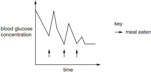 The graph shows the changing blood glucose concentration in one person over 24 hours.