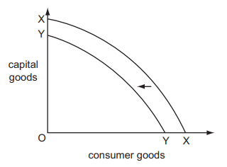 A country’s production possibility curve moves from XX to YY as shown in the diagram.