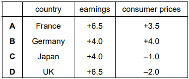 The table shows the percentage changes in earnings and consumer prices for four countries for one year.