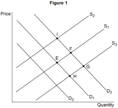 Market equilibrium is initially at E, the intersection of D$_1$ and S$_1$.