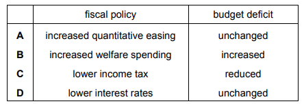 Which combination correctly classifies an expansionary fiscal measure and its impact on a budget deficit?