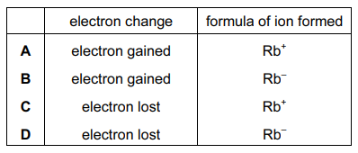 Which row shows the electron change taking place for rubidium and the correct formula of the rubidium ion?