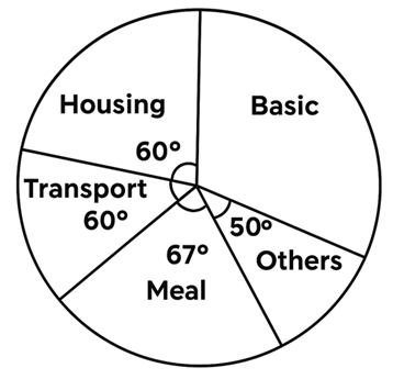 The pie chart shows the income of a civil servant in month. If his monthly income is N6,000. Find his monthly basic salary.
