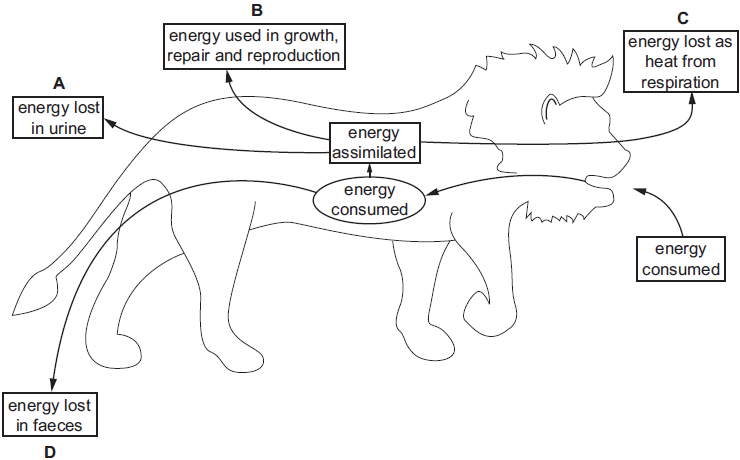 Of the prey consumed by the lion, into which box does the largest amount of energy go?