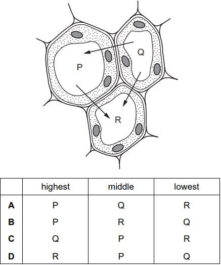 The diagram shows three plant cells labelled P, Q and R. The arrows show the direction of water movement by osmosis.