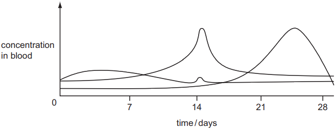The graph shows the concentration in the blood of three of the four hormones FSH, LH, oestrogen and progesterone during a menstrual cycle.