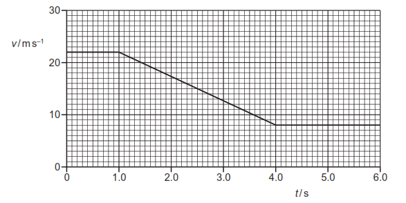 A car travels along a straight horizontal road. The graph shows the variation of the velocity $v$ of the car with time $t$ for 6.0 s of its journey.