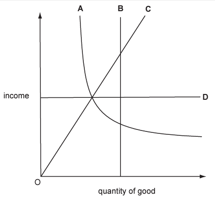 The diagram shows how the quantity demanded of four goods changes as income changes.