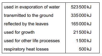 A square metre of grassland receives about 1047000 kJ of solar light energy each year.