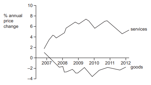 The graph shows the annual percentage change in the prices of services and in the prices of goods between 2007 and 2012.