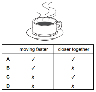 Which row describes the water particles in the air above the cup compared with the water particles in the cup?