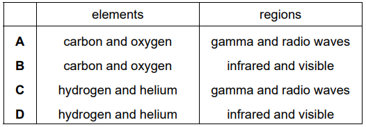 Which row shows the most common elements in the Sun and the regions of the electromagnetic spectrum in which most of the Sun’s energy is radiated?