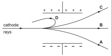 A beam of cathode rays passes between two parallel metal plates connected to a high-voltage d.c. power supply.