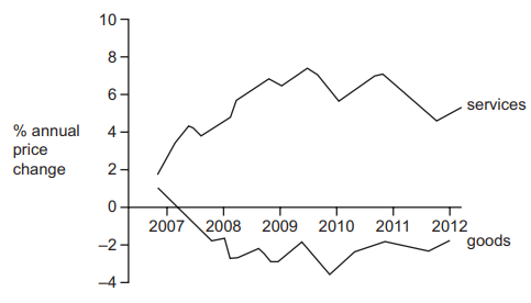 The graph shows the annual percentage change in the prices of services and in the prices of goods between 2007 and 2012.