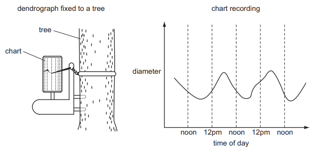The diagram shows a dendrograph fixed to a tree. The dendrograph records changes in the diameter of the tree.