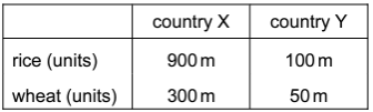 The table shows how much rice and wheat two countries, X and Y, can grow when each country divides its resources equally between growing rice and wheat.